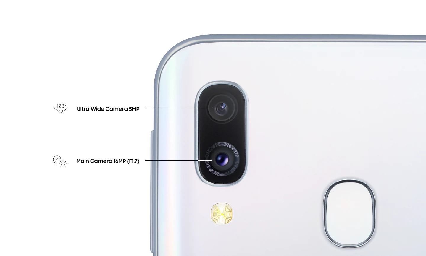 The Galaxy A40’s stunning Dual camera consists of a 16MP (F1.7) camera and a 5MP Ultra Wide Camera with a 123-degree field of view. It’s able to see every scene just like the human eye and capture every single memory.
