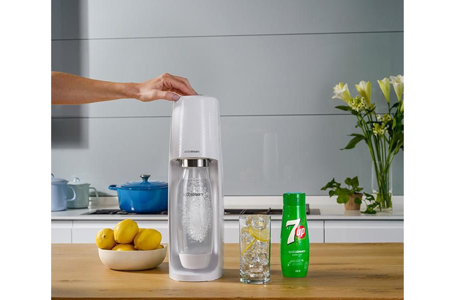 Make your own 7Up Lemonade with your Sodastream Sparkling Water Maker with the push of a button. Enjoy the refreshing lemon taste all while saving on single-use plastic bottles.